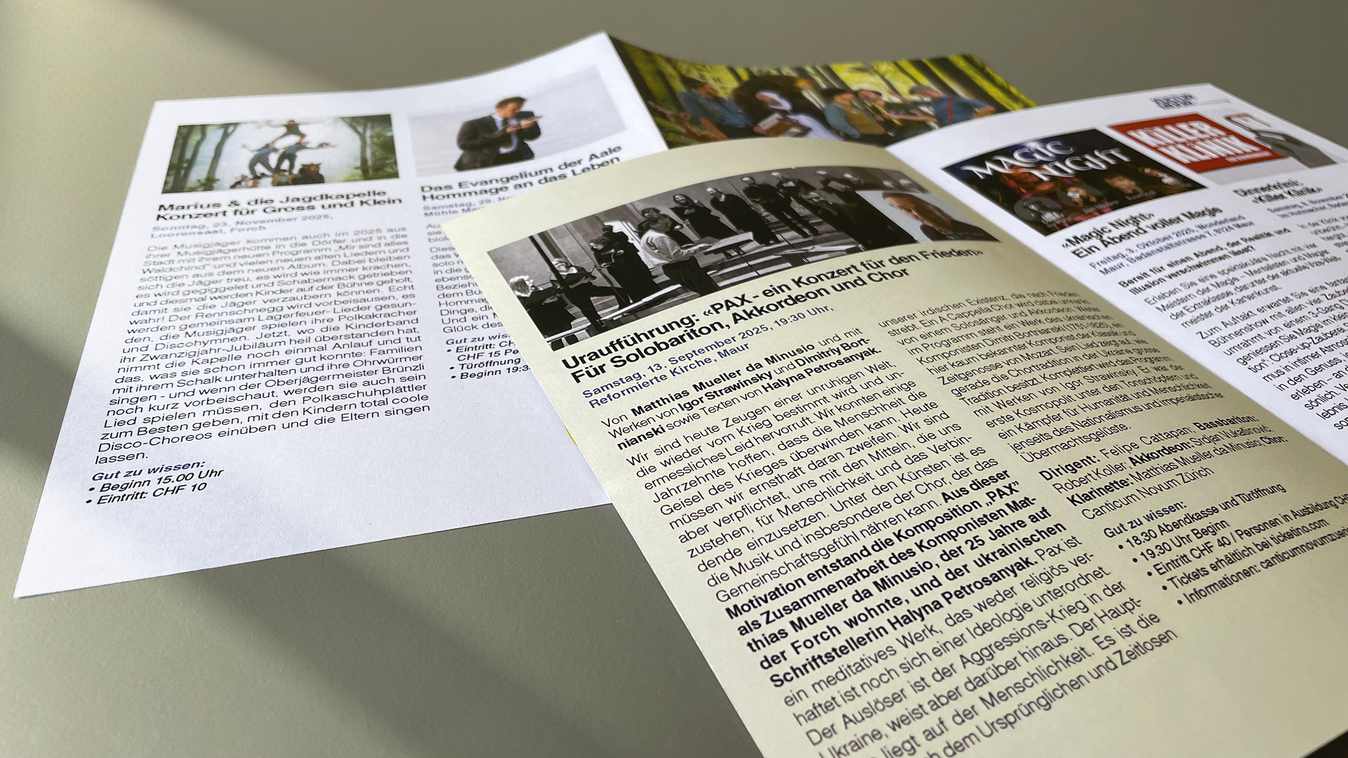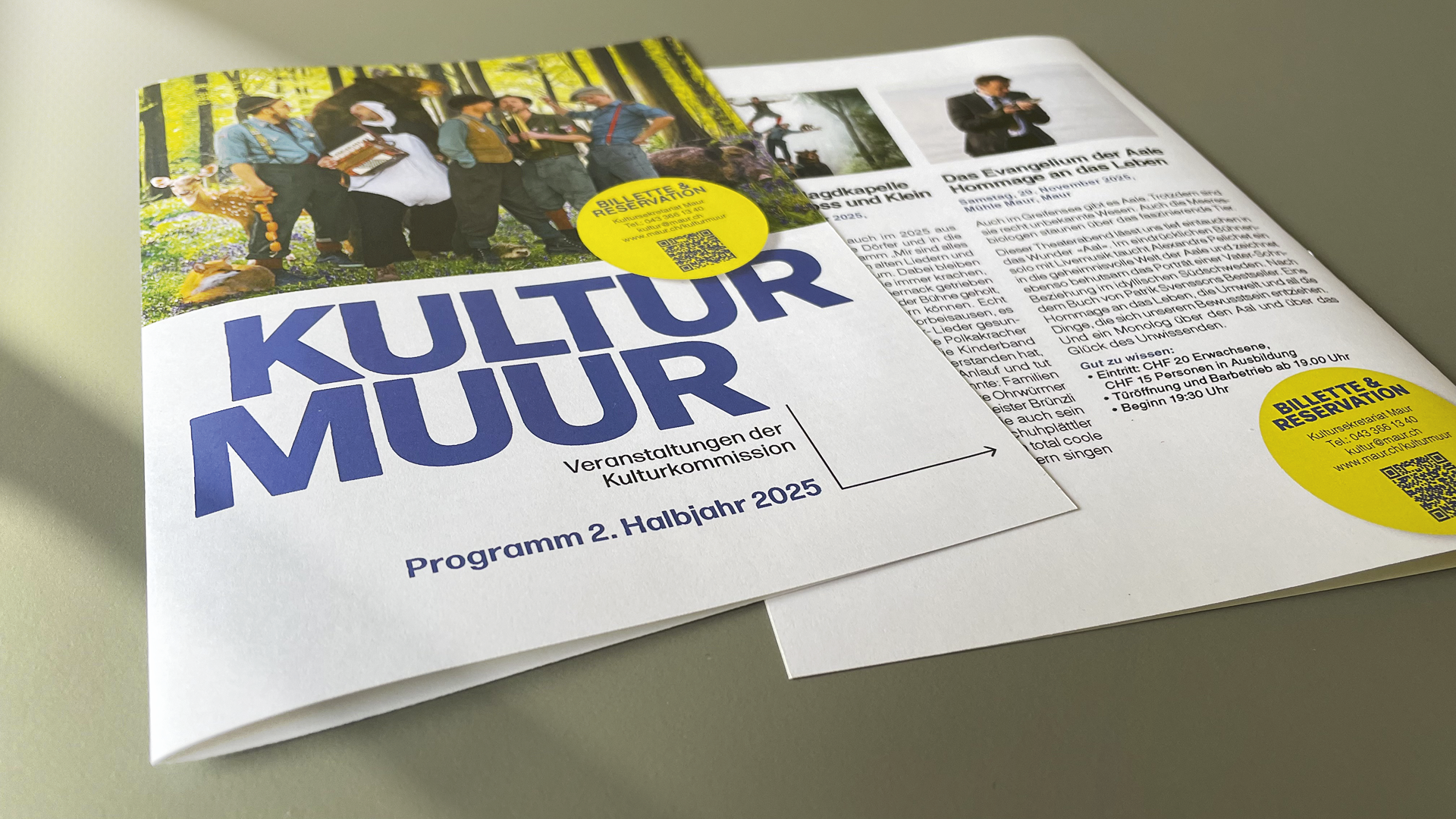Im Auftrag der Kulturkommission der Gemeinde Maur entstand der Flyer «KULTUR MUUR», der zweimal jährlich an alle Haushalte verteilt wird. Dieser Flyer fungiert als Veranstaltungskalender und informiert übersichtlich über aktuelle und bevorstehende kulturelle Ereignisse in Maur.
